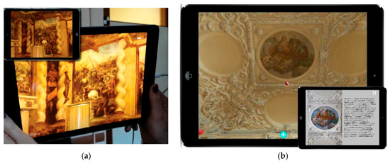 In the Honour Salon of the Valentino Castle, (Figure 23a), an AR test was performed [56] using the software solution by Metaio (no longer active, since being acquired by Apple). Here, it is possible to view the Honour Salon by simply moving the device, just as if you were inside the scene, and then, thanks to the framing by the camera of the simplified greyscale DSM of the dome, enable the visualization on it of the 3D model. It is a rather interesting shared use of technologies: the 6D Augmented Reality Holodeck technology (named 6D-AR) takes the advantages from SLAM algorithms and from the on-board IMUs motion sensors to attach the virtual environment to the real world, exploiting the camera of smart devices [57]. Moreover, in this case, it is obviously possible to learn the decorative themes of the frescoes, which consist in the exaltation of the Savoy family through the re-enactment of military enterprises. At the same time, it is possible to examine the expertise of the scenic installation that reproduces twisted columns and a balcony that was executed by Isidoro Bianchi who painted with the collaboration of his sons between 1633 and 1642 [31].