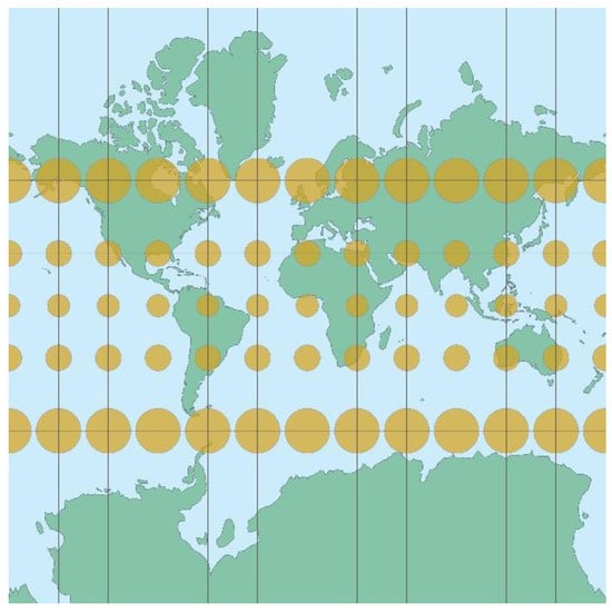 However, map users should also be aware of some important drawbacks of the projection method that could lead to the misinterpretation of maps [23,24]. One example is the lack of area preservation, which means that the area of countries situated toward the poles is represented proportionally larger than those near the equator. This can be visualized by a Tissot indicatrix (see Figure 1). This characteristic can easily be misused in thematic maps representing quantitative data [25]. Cartographers and geographers recognize this conceivable misuse [22,24,26]. However, many users outside the cartographic community are unaware of the specifications and issues inherently related to the type of projection used, and, even if they are familiar with the distortions, Battersby [27] discovered that the average individual is unable to compensate for it accurately. Since the Web Mercator projection is implemented in many web applications that rapidly disseminate information around the world, the consequences of such cartographic inaccuracies and related potential misinterpretations are myriad.