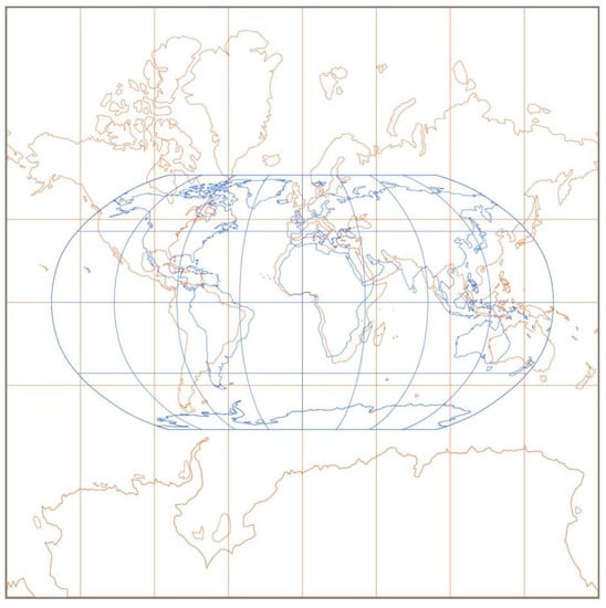 - Šavrič, B.; Jenny, B. A new pseudocylindrical equal-area projection for adaptive composite map projections. Int. J. Geogr. Inf. Sci. 2014, 28, 2373–2389. [Google Scholar] [CrossRef]