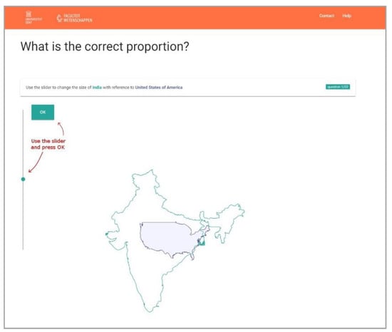 Afterwards, the participants were asked to estimate the real size of the test regions compared to a fixed reference region that was familiar to them such as Europe for BEL2017 and the conterminous United States for US2017. A web application was developed in which participants could graphically scale a test region relative to the reference region using a slider. The 29 test regions were visualized, in random order, one after the other, on top of the reference region (Figure 3). The participants were instructed not to use any other website or map as an aid during the test. There was no time limit for completing the test. After scaling each test region, the participants had to answer two questions to determine how certain the participants were about their answers: ‘How sure are you of your answer?’ (‘Very certain,’ ‘Certain,’ ‘Neutral,’ ‘Uncertain,’ or ‘Very uncertain,’ which are, respectively, categorized in the database as 1, 2, 3, 4, and 5) and ‘Can you locate this country or continent on a world map?’ (‘Yes,’ ‘Approximately,’ or ‘No,’ respectively, categorized in the database as 1, 2, and 3). This question could have been replaced with a tool to let participants mark the location on a map. Although, this would provide valuable data, this extra action for 29 regions would be too time-consuming for the students and teachers. Therefore, it was decided to let the participants scale their knowledge.