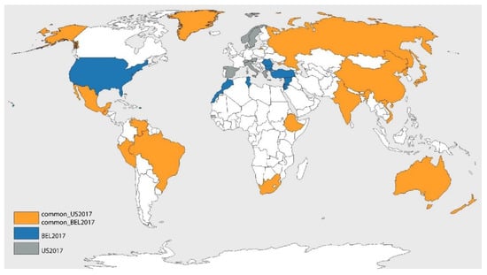 When comparing the two US datasets, the continents of US2017 were not included. The dataset US2017 consisting of 23 countries and two regions receive the reference: ‘US2017_country.’ When analyzing the two studies of 2017, only the 15 common countries, two regions, and three common continents were considered. The suffix ‘common’ is used to refer to the common group of test regions: ‘common_US2017’ and ‘common_BEL2017’ (Figure 4).