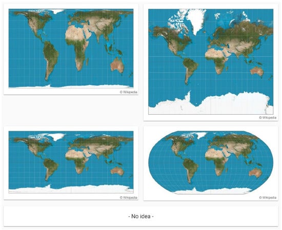 Consequently, more Belgian students selected the Gall-Peters projection as an equal-area projection. Still, one-third of American students were aware of the Mercator map distortions as well. This can be triggered by the recent debate about the use of map projections in the education system that has been in the media [52,53,54,55,56]. Despite 72% of the American students not selecting the Gall-Peters projection as an equal area, only 55% of the Belgian students considered the Gall-Peters projection as a non-equal-area, which is in line with the findings of Battersby and Kessler [57]. In their study, 51% of the participants wrongly indicated that this projection distorts area. For the Gall-Peters projection, the distorted shape of regions was a crucial factor to evaluate this map as a distorted area. Furthermore, Battersby and Kessler [57] discovered that the Robinson projection is considered the least distorted projection and is probably encountered as what MacEachren [58] refers to as a ‘map schema’—a general mental image of a global-scale map. These findings correspond with our results that both American and Belgian students acknowledge the Robinson projection as the most familiar. This familiarity could be a result of the shape of the countries and regions that are considered not distorted. Second, the Robinson projection is still widespread in Belgium, as well as in the US [57], since it was selected as the primary map projection by the National Geographic Society from 1988 until 1998 and since then has been applied for several purposes such as for education in textbooks and in atlases as world map projection (e.g., De Boeck atlas). Currently, other, similar-looking, compromised map projections are common in education or the media. For example, the Winkel-Tripel and Van Grinten map projections (e.g., Plantyn Algemene Wereldatlas, Collins World Atlas, and New Concise World Atlas). It is noticeable that the students were more familiar with a compromised map projection than with the Web Mercator projection utilized by web maps, such as Google Maps. These web maps are used frequently by young people but possibly mostly as a navigational instrument and, therefore, on a local scale and not a global level, such as the global maps in atlases.