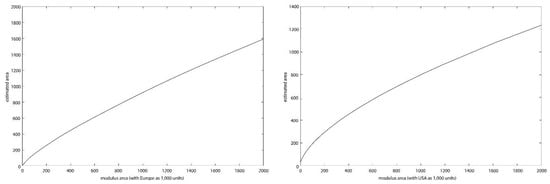 The negative correlation coefficients between the absolute values of the relative estimated accuracy and the modulus area (Table 8, row 5) (r = −0.737 (BEL2017), r = −0.898 (US2017)) revealed that smaller regions are relatively overestimated. This finding was also confirmed by the prediction of the estimated area in function of the modulus area, which was calculated by the power function (Table 8, row 6) [47], with Aest as the estimated area, Aact as the real area, the exponent β, and scaling constant k.