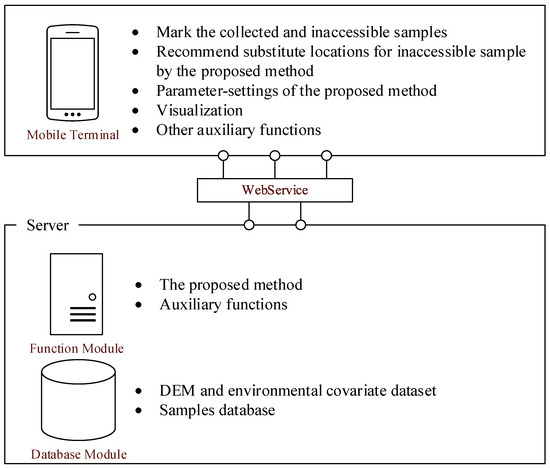The proposed method was implemented in a prototype system on a mobile phone platform. The system consists of two components (Figure 1): The mobile terminal for user interface, and the server including a function module and a database module. The two components are connected using WebService for network communication. Through the mobile terminal, users can set all parameters in the proposed method, including marking the inaccessible sample and the collected samples, setting the scenarios for collecting the substitute samples, and modifying the thresholds and weights based on the actual situation. This architecture utilizes the portability of the mobile device and the powerful computing capability of the server to facilitate field surveyors’ flexible operation during the field campaign with guaranteed computation efficiency.