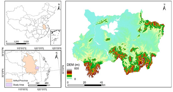 The study area (Figure 2) is about 5800 km2, located in Xuancheng County in Anhui province, China. It lies in a transition zone between the mountainous southern Anhui and the middle and lower reaches of the Yangtze river. The northwestern part of the study area is plain, while the eastern and southern parts are low hills. The elevation in the area ranges from 5–825 m.