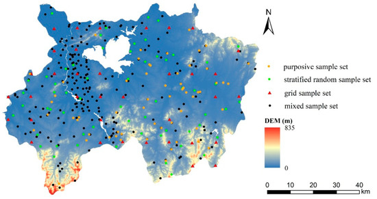 From previous field campaigns in the study area, we obtained a total of 399 soil samples (Figure 3). Among them, there are two complete sets of modeling samples for DSM used in previous studies, i.e., a set of 59 samples designed based on purposive sampling strategy with environmental similarity calculated from the above-mentioned environmental covariates (“purposive sample set,” for short) [22], and another set of 59 samples designed using stratified random sampling strategy stratified with the parent material variable (“stratified random sample set,” for short) [8]. Aside from these two sample sets, there are 57 samples designed using grid sampling strategy (“grid sample set,” for short) used as independent evaluation samples for evaluating DSM methods [24]. The other 224 samples (“mixed sample set,” for short) were collected during multiple field campaigns and originally used for testing other field sampling design and DSM methods [8,25]. The values (in the unit of %) of soil organic material (SOM) in the depth of 20—40 cm were recorded for all these soil samples and used as the target soil property in this experiment.