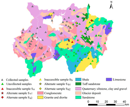 As outlined in Section 4.3.1, substitute sample locations were recommended for the purposive sample and stratified random sample sets (Figure 4, Table 3). In Figure 4, the triangle points are predesigned samples. The gray-colored points are those assumed to have been collected and green are not yet. Areas with different colors indicate different stratifications (parent material) in stratified random sampling. The selected inaccessible stratified random sample and its substitutes are colored in red and those with purposive sampling are in yellow. The star-shaped points are substitute locations recommended under the instant sampling scenario which appear closer to the original sample. The cross-shape points are recommended under the subsequent sampling scenario and thus show up near the not yet collected samples.