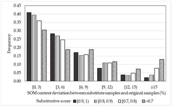 The frequency of SOM content deviations in different ranges for substitute samples with varied substitutive scores.