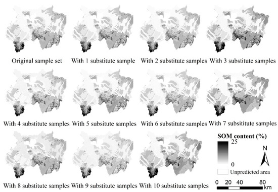 Some examples of the resulting SOM content maps from the input realizations are shown in Figure 6. Figure 6 shows that the mapping results hold very similar spatial distribution when different numbers of original samples were substituted. Generally, the northwest area has lower SOM content and southeast shows higher SOM content. The highest SOM is seen in a small area at the southwest corner of the study area. The locations of these distinct parts are consistent across the different mapping results, though the precise predicted values of SOM content vary with input realizations. This illustrates that substitute locations recommended for different modeling samples by the proposed method can be used to build soil-environment relationships similar to that built with the original modeling sample set.