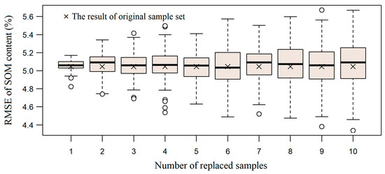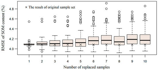 The RMSE results of SOM content prediction is shown in Figure 11. The median values of RMSE for all numbers of substitute samples are fairly close to that of the original sample set. With less than six substitute samples, the RMSE values lie mostly in the range (4.6%, 5.4%), with the RMSE of original sample set being about 5.0%. The range of RMSE does appear larger when the number of substitute samples is greater than five. However, in most cases, the deviations are smaller than 0.6, and the RMSE results distribute evenly around that of the original sample set. This is in agreement previous findings on that substitute samples’ influences on DSM model performance relatively small when only a small number of samples are replaced.