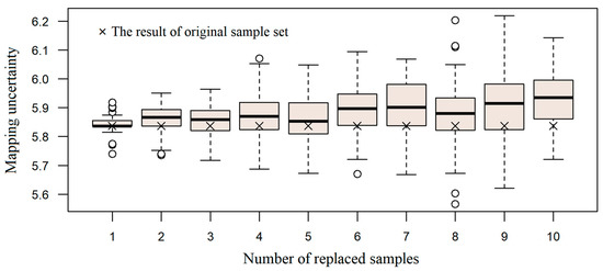 The prediction uncertainties of the independent evaluation samples were calculated with iPSM and the sums of the uncertainty values of all 57 independent samples were plotted in the boxplots in Figure 8. Similar to RMSE, when the number of replaced samples increases, the uncertainty generally increases too. With less than six samples substituted, the medians of the uncertainty values are close to the mapping uncertainty of the original sample set. When the number of replaced samples increased to as many as 10, the deviation of the sum of uncertainties from that of original sample set is smaller than 0.4. Considering all 57 independent evaluation samples, the average uncertainty deviation for each sample is less than 0.007, which is rather trivial. When more substitute samples participate in predictive mapping, the overall representativeness of the sample set to the soil-environment relationship in the study area might decrease. This might be because the original purposive samples were designed to be the most representative [4,5,8]. The other possible reason is that, in this experiment, the proposed method only considered those locations with previously obtained samples for substitute location recommended, which might not be optimal. The decline in overall representativeness of sample set brings about the increase of prediction uncertainty in results of iPSM with such modeling sample set. The prediction uncertainty reflects the reliability of predicted SOM value, and explains the change of RMSE in Figure 6 as well: When mapping uncertainties increase, the mapping results are less accurate, thus higher RMSE. In this case study, the influences of substitute samples are in overall trivial when the number of inaccessible samples changes from one to 10, but are more insignificant when less than six substitute samples are used.