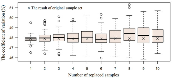 Figure 8 shows the distribution of CVs of the resulting sample sets at different numbers of replaced samples. According to Duyckaerts and Godefroy [32], random distributions have CV between 33% and 64%, with a higher than 64% CV meaning the distribution closer to being clustered, while a CV lower than 33% suggesting regular distribution. Figure 9 shows that when the input realizations with the number of replaced samples changes from 1oneto 10, the CV varies between 46% and 51%, and centers around 48%. All decrease in the random distribution range. This indicates that for stratified random sampling, the use of substitute soil samples recommended with the proposed method does not change the distribution pattern and randomness of the original sample set.