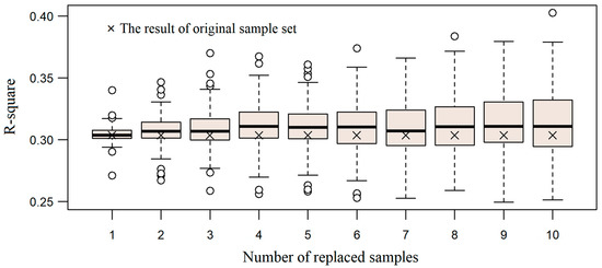 DSM was conducted with MLR for each realization. The distribution of R-squares of the DSM results at different numbers of replaced samples are also shown in boxplots (Figure 10). Figure 10 shows that the R-square values fall in the range (0.27, 0.35), with the R-square from the original sample set being 0.30. For most cases, the R-square values lie evenly above and below that of the original set, indicating a random change in the model performance. From Figure 9, we can also see that when substitute samples are less than six, the decrease of R-square is less than 0.03 and the lower quartiles are above 0.30, meaning three-quarters of the results are over 0.30. The influence of substitute samples on the DSM model is comparatively small under this situation.