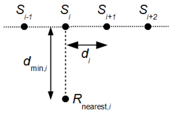 where is the current sound level at receiver R due to all the active sources i with , where is the maximal source–receiver distance that is allowed for the computation (i.e., a calculation parameter; see Section 4.2.2). Thus, when this criterion is fulfilled, all the real sources in this new additional active zone are considered and, thus, used to update the sound level at receiver R. An another hypothetical sound source is introduced at a larger distance from the receiver and the criterion is checked again. The process is repeated again until the value of the distance from the receiver reached the maximal source–receiver distance .