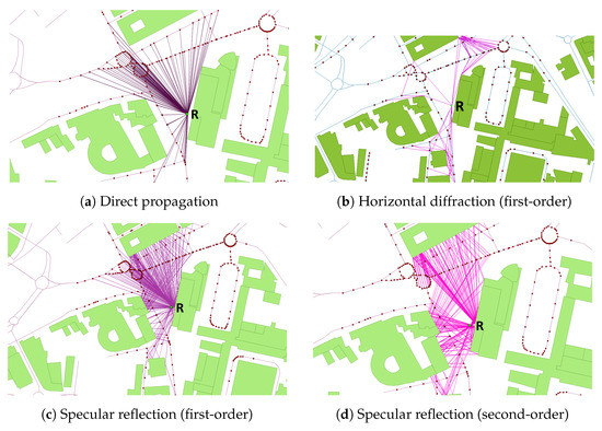 - the reflected field, associated with the reflections on the ground and on the buildings facades along the propagation path that can also include absorption by these elements (Figure 2c,d).