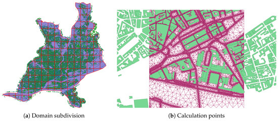 Each subdomain is then meshed with a thin and adaptive triangulation method in order to build the grid of calculation points (i.e., the point receivers). This triangulation process handles the continuity between the subdomains, in order to recompose, at the end of the process, the noise map on the whole domain. In addition, one can also adjust the maximum size of a mesh, and a grid refinement at the vicinity of the traffic lanes, using specific meshing parameters and , respectively (see Section 4.2.2).