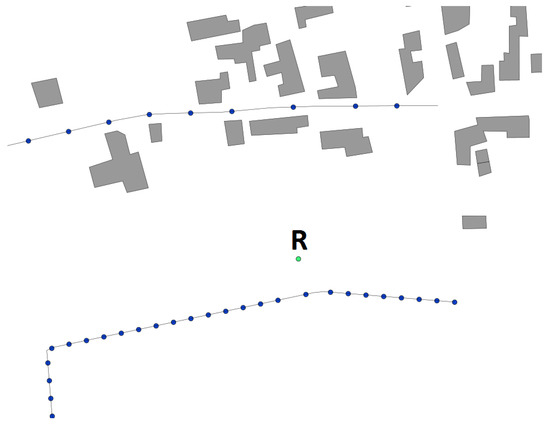 Example of the consideration of the point sources (in blue) for a given receiver R (in green). The discretisation of the line sources depends on the distance from the receiver.