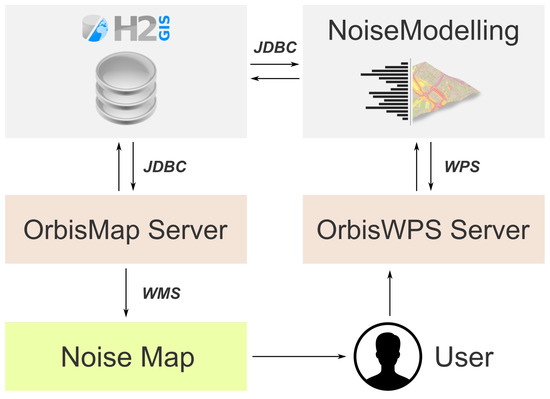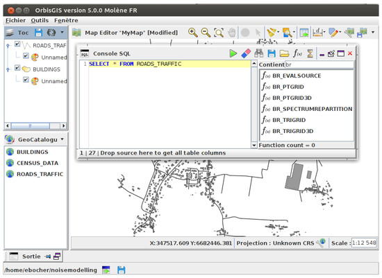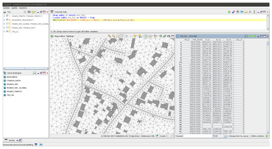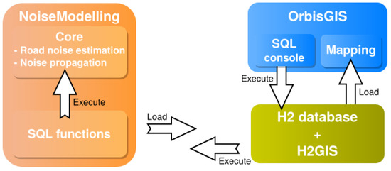 The proposed prediction method is implemented in an open source GIS ecosystem. As described in Figure 6, the general framework consists of three main modules, written in JAVA: the NoiseModelling plugin, the H2 database (website: http://h2database.com/) with its H2GIS extension (website: http://www.h2gis.org/) [66] and the OrbisGIS platform [67].