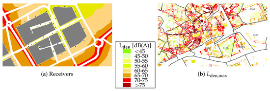 The subdivision depends on two parameters: the size of the calculation domain (i.e., the area covered by the receivers) and the limit value of source–receiver propagation (parameter in Section 4.2.2). The continuity between subdomains is ensured by taking into account the “active” sound sources from adjacent subdomains (Figure 4). This subdivision process is only required for large computational domains. Besides, in certain cases, the need in acoustic indicators calculations is limited to a few fixed observation points, which reduces the computation time (no mesh or building up of subdomains, and limitation of the number of receivers).