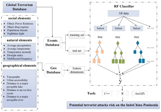 In this study, the geospatial statistics method was used to analyse the spatio-temporal evolution of terrorist attacks on the Indochina Peninsula. On this basis, a machine learning approach, the RF algorithm, was proposed to predict potential terrorist threats at the spatial scale. The main steps to achieving the goal are as follows: