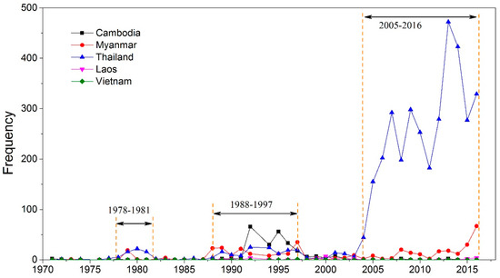 Terrorist attacks occurring on the Indochina Peninsula between 1970 and 2016 were extracted from the GTD. On the Indochina Peninsula, 4348 terrorist attacks occurred, causing 4302 deaths. To analyse the spatio-temporal evolution of the terrorist incidents on the Indochina Peninsula, the terrorist attack data were spread to the map from the perspective of time and space with kernel density estimation, as shown in Figure 2.