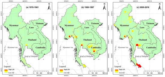 The spatial changes in the hotspots of the terrorist attacks on the Indochina Peninsula in three peaks. The figure was obtained by the “Kernel Density” tool in ArcGIS software. The original values of the legend in panels (a–c) were different. These three pictures were drawn with a unified standard of the legend to increase the legibility. It reflects the spatial migration of terrorist attacks in different periods.