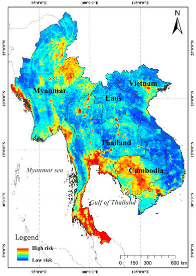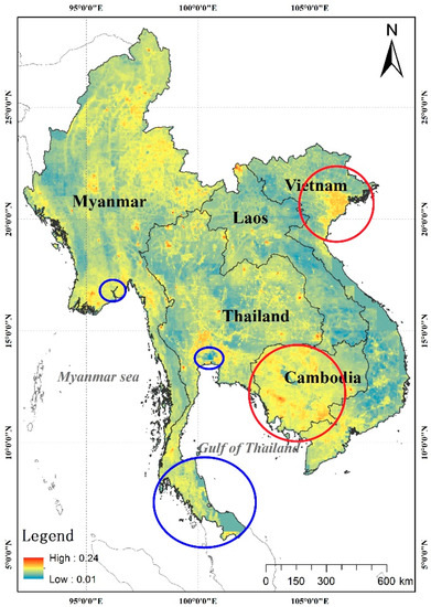 Figure 6 shows that the uncertainty of the prediction result was low. The relatively high uncertainty was in the high-risk areas of Cambodia and Vietnam (the areas circled in red in Figure 6). The uncertainty of high-risk areas in Thailand and Myanmar (the areas circled in blue in Figure 6) were relatively low. This shows that Thailand and Myanmar governments should strengthen their prevention efforts compared with that of Cambodia and Vietnam.