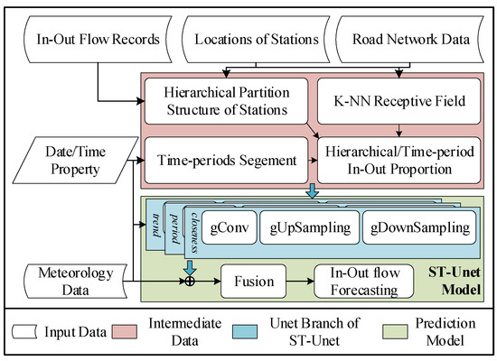 - Hierarchical/Time-period In–Out proportion. According to the hierarchical structure of stations and different time periods, the maximum likelihood estimation method is used to estimate each station’s in–out flow proportion within its cluster. Such information is used to correct the up-sampling operation, replacing the usual adopted method—padding (See Section 3.4).