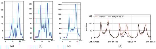 Figure 3. (a,b) The variation in out-flow count of two stations in one day. (c) The variation in out-flow count of a region with seven stations in one day. (d) The effect of weather on the fluctuation of crowd flow (27 October, 2016 in New York City was a rainy day). - Time-periods Segmentation. Considering the temporal heterogeneity of crowd flow, we categorize according to seven time periods: 1. 7:00 a.m.–11:00 a.m. (morning rush hours); 2. 11:00 a.m.–4:00 p.m. (day hours); 3. 4:00 p.m.–9:00 p.m. (evening rush hours); and 4. 9:00 p.m.–7:00am (night hours); and 5. 0:00 a.m.–9:00 a.m. (night hours); 6. 9:00 a.m.–7:00 p.m. (trip hours); and 7. 7:00 p.m.–12:00 p.m. (evening hours) on weekends/holidays. Each time slot is labelled with a property field ‘’ indicating what kind of time periods it belongs to, i.e., .