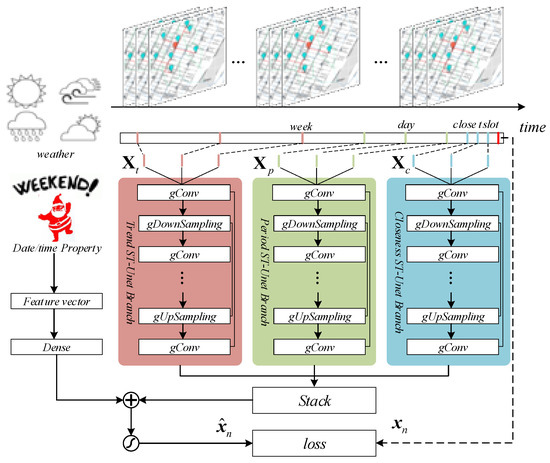 where l is the length of time slots chosen to stack, , and are the length of one day’s and one week’s time slots, respectively. The blue branch stacks the records of recent time slots; the green branch stacks the records of the same time slots as yesterday; the red branch stacks the records of the same time slots as last week. They separately model three temporal properties: closeness, period, and trend. The bottom branch uses one layer of the fully connected neural network to introduce the external feature vector, including weather and date/time properties. The weather features include precipitation, wind speed, temperature, visibility, etc. The date/time property features contain workday/weekend, holiday or not, kind of time period, etc.