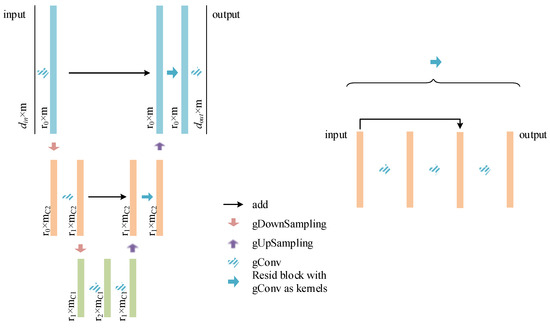 On the left is the architecture of a single Unet branch; on the right is the unfolded format of the resid block with gConv as kernels.