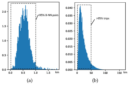 (a) The distance distribution of 8 nearest neighbors (8-NN) stations reachable on the road network of each station. (b) Trip distance distribution in New York Citi Bike-sharing system.