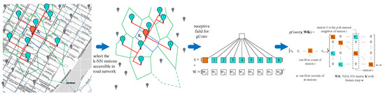 To simplify the operations, we assume only the prediction of out-flow for a moment. Let is a feature map. As shown in Figure 7, the convolutional operation of each station is . For all stations, gConv can be depicted in matrix form:
