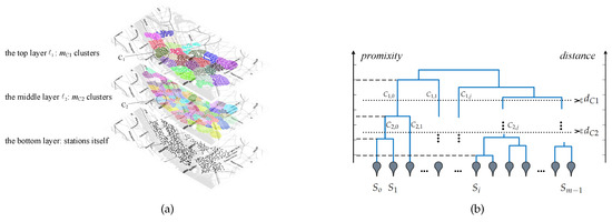 Figure 8b shows the core idea of agglomerative clustering to determine the hierarchical structure of stations. Agglomerative clustering is a ‘bottom-up’ type hierarchical clustering: each observation starts in its own cluster, and pairs of clusters are merged as one moves up the hierarchy [23]. Two goals are achieved by using the stations’ proximity matrix Z. First, stations in one cluster should be close to each other in the road network. Second, stations in the same group have similar in–out crowd flow patterns.