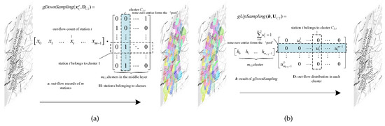 where means station belongs to cluster in the layer , , is the station ’s out-flow proportion in cluster , estimated by the maximum likelihood estimation method according to different time periods. The non-zero entries in each column in and in each row of denote the ‘pools’ of gDownSampling and gUpSampling, respectively.