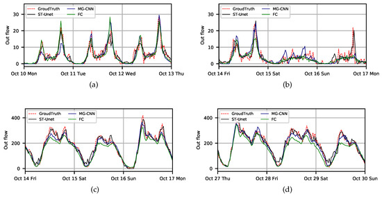 As shown in Table 3, ST-Unet with other deep learning-based methods (FC and MG-CNN) shows better performance than the other baselines on the whole. However, FC shows an unstable forecast performance among different datasets, owing to its fully-connected layers containing too many parameters for training. ST-Unet performs slightly better than MG-CNN. With long short term memory (LSTM) cells, MG-CNN uses only the history data from the past six time slots to forecast the flow in the subsequent time slot [17]. Details can be found in Figure 10, where we present some forecast examples of different time periods (holiday: 10/10/2016; weekends: 15–16/10/2016 and 14–15/10/2017; rainy day: 29/10/2017; the others are workdays). It shows that ST-Unet performs better than FC and MG-CNN at the peaks of crowd flow.