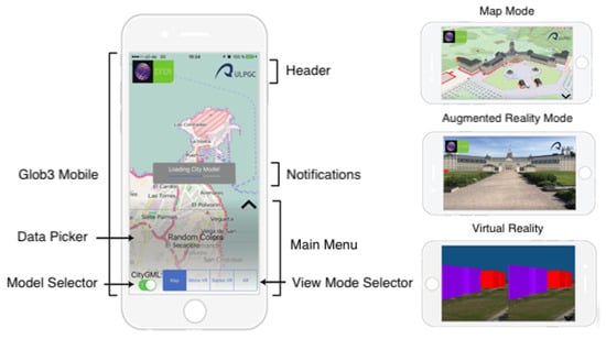 - Santana, J.M.; Wendel, J.; Trujillo, A.; Suárez, J.P.; Simons, A.; Koch, A. Multimodal location based services—Semantic 3D city data as virtual and augmented reality. In Progress in Location-Based Services 2016; Springer: Berlin/Heidelberg, Germany, 2017; pp. 329–353. [Google Scholar]