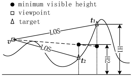 The direct LOS method and the LOS height. The curve represents the profile of a terrain. v is the viewpoint above the terrain. t1 and t2 are two adjacent targets on the terrain. The direct LOS method determines the visibility of a target point by comparing its predicted minimum visible height and its elevation. The elevation of t1 is higher than its predicted minimum visible height. t1 is visible and t1’s LOS height H1 equals the actual elevation of t1. The elevation of t2 is lower than its predicted minimum visible elevation. t2 is invisible and its LOS height H2 equals the minimum visible height.