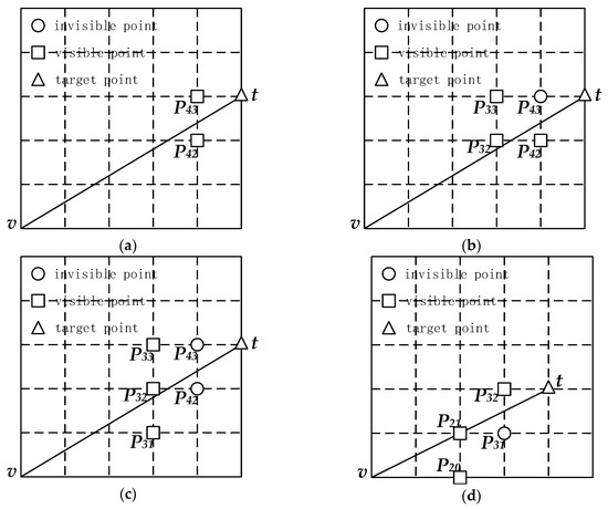 The number of contributing points. v is the viewpoint. t is the target point. A rectangle point represents a visible point and a round point represents an invisible point. (a) t’s two reference points, P42 and P43, are both visible. t has two contributing points: P42 and P43; (b) one of t’s reference points, P43, is invisible. Suppose the contributing points of P43 are P33 and P32. t has three contributing points: P42, P32 and P33; (c) t’s two reference points, P43 and P42, are both invisible. Suppose the contributing points of P43 is P33 and P32. Suppose the contributing points of P42 is P32 and P31. P43 and P42 share a common contributing point P32. t has three contributing points: P31, P32 and P33; (d) one of t’s reference points P31 is invisible. Suppose the contributing points of P31 is P21 and P20. t has three contributing points: P20, P21 and P32. P21 lies right on the LOS of t.