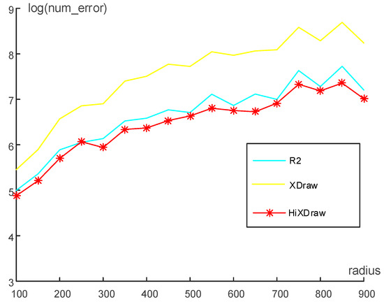 The average number of error discrimination varies with the radius as shown in Figure 6. That the curve is lower means better accuracy. HiXDraw (red) performs better than R2 (cyan) and much better than the original XDraw (yellow).