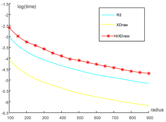 With the time of R3 being one, Figure 7 shows the relative time of different algorithms in logarithm. The time complexity of R3 is O (r3). The time complexities of other methods, including HiXDraw, are O (r2) with different constant coefficients. XDraw (yellow) is the fastest among these algorithms. HiXDraw (red) is slower than R2 (cyan).