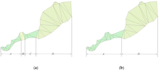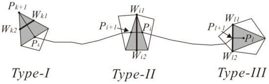 As shown in Figure 2, the width of a triangular element is defined as follows: the width of the Type-I triangle is the distance between the midpoints of the two Type-I sides, as shown by in Figure 2; the width of the Type-II triangle is the distance from the midpoint of the Type-I side to the corresponding vertex, as shown by in Figure 2; and the width of the Type-III triangle is the length of the intersected side of the skeleton line, as shown by in Figure 2.