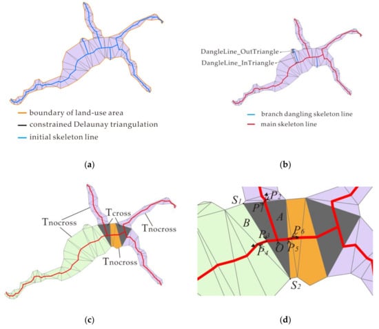 Step 1: A constrained Delaunay triangulation is created for the complex land-use area, where the initial skeleton line is extracted based on the triangle classification, as shown in the blue solid line in Figure 3a, and the topology is constructed according to the initial skeleton line.