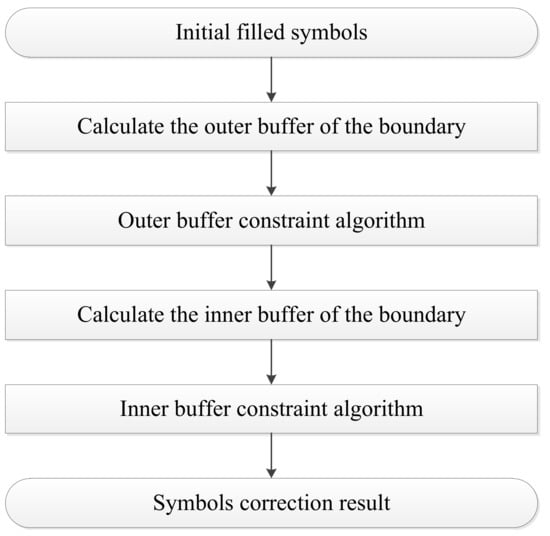 As depicted in Figure 5, symbol correction is implemented by calculating the boundary outer and inner buffers and their respective buffer constraint algorithms. Symbols located outside the area and adjacent to the boundary can be moved from outside to inside via the outer buffer constraint algorithm. Symbols located inside the area and adjacent to the boundary can keep an appropriate distance from the boundary by the inner buffer constraint algorithm.