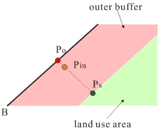 Step 3: The specific processing method of shifting is shown in Figure 6. First, the nearest neighbor point po from pout to B is calculated; next, the symmetry point ps of pout is calculated based on point po, and ps is the alternative point of pout under the constraint of the outer buffer of the boundary.