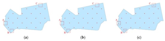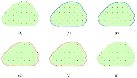 Figure 8 is an example of symbol filling of a certain area under boundary constraints. Figure 8a shows the initial tree-square shaped fill effect. It is observed that some symbol points are outside the boundary of the area. These points, resulting from the application of the outer buffer constraints, are shifted to the inside of the area, as shown in Figure 8b,c. After the inner buffer constraint has been applied, the point near the boundary can maintain a moderate distance from the boundary, as shown in Figure 8d,e; the final filling result is shown in Figure 8f.