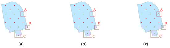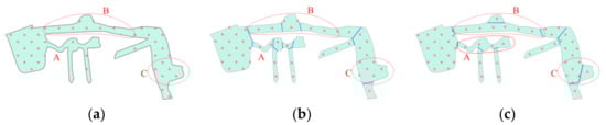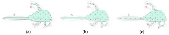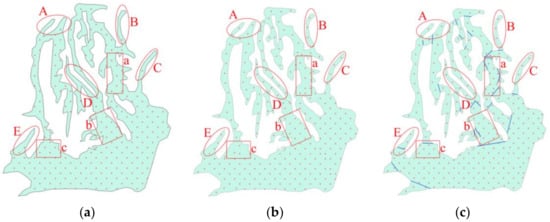 Figure 10 shows that although a certain number of branches can be processed by the filling method based on simple segmentation, as shown in ellipses B, C, and D in Figure 10b, the segmentation of the branches depended on the Type-III triangles among the Delaunay triangles. Therefore, the narrow part of the extended area could not be identified, as shown in ellipse A in Figure 10b. This method could identify such a branch and fill it, as shown in ellipse A in Figure 10c. In addition, at the boundary of a complex area, the filling effect of the filling method based on a simple segmentation was too sparse, while that of the proposed method was more compact, as shown in rectangular box a in Figure 10.