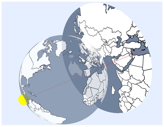Determining the pixel color based on the position of the intersection is carried out by sampling a texture, i.e., an image that can be referenced using the 2D normalized coordinates u, v ∈ [0, 1]. Probably the simplest way to retrieve such normalized coordinates based on an intersection point is as follows: firstly, the 3D coordinates with x, y, z ∈ [−1, 1] of the intersection point have to be converted into 3D spherical coordinates with inclination θ ∈ [0, π], azimuth φ ∈ [−π, π], and radius r = 1. Normalizing both, θ and φ, to the range [0, 1] yields an exact mapping to the required texture coordinates u, v. This direct mapping of spherical coordinates to Cartesian coordinates requires the texture to depict the earth in the equirectangular projection. Sampling is carried out using anisotropic filtering to ensure a crisp image (see, e.g., Reference [] for more details). A texture can contain any information of interest, such as the globe’s topography, the geographic grid, or Tissot’s indicatrices. Overlaying different textures can be achieved by blending the colors from each texture sample.