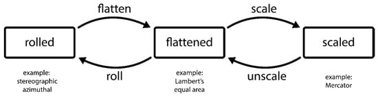 The high-level steps of the construction process and the transitions between them are depicted in Figure 3. In the first, initial state (“rolled”), the basic projection properties such as the type of surface and the position of the light source are defined. This already allows creating a limited set of possible plane-based projections, such as the stereographic azimuthal or the gnomonic azimuthal projections. Cylinder- and cone-based projections, however, need to be flattened to form the actual map. There are numerous projections that can be obtained this way, such as Lambert’s equal area projection or Braun’s stereographic projection. However, many projections cannot be obtained this way such as the Mercator projection, which requires a non-linear scaling. A scaled map cannot be directly rolled again as the introduced distortions may not be geometrically reconstructed. Therefore, the scaling operation needs to be undone to obtain a rollable map.