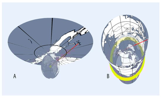 Two configurations of the light source: (A) point light source placed in the center of the globe; (B) circular light source representing multiple varying positions of the light source depending on the longitude. The light rays used to draw specific points on the projection surface are highlighted in red.